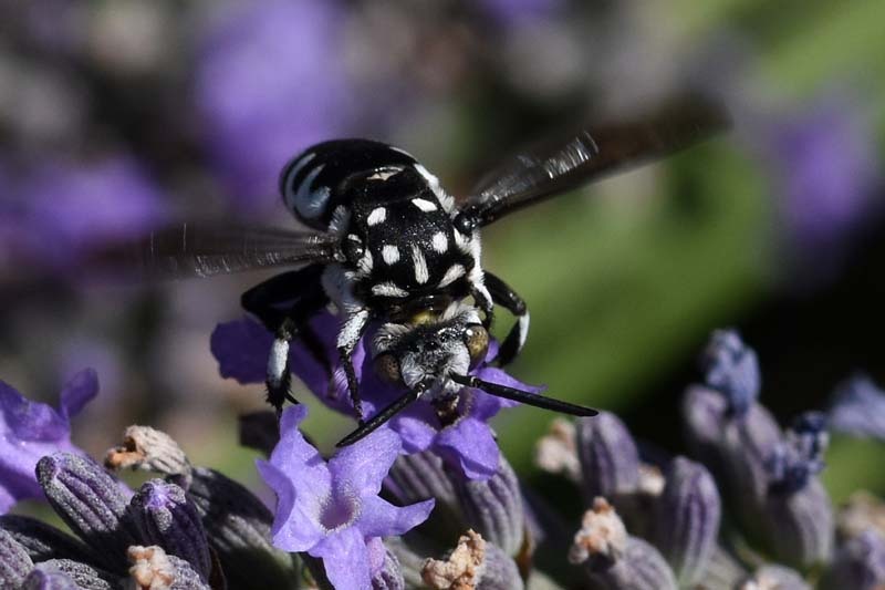 Petite abeille remarquable (en noir et blanc), 10 à 12 mm, 3 cellules cubitales, longue langue, peu de poils sur l'abdomen,