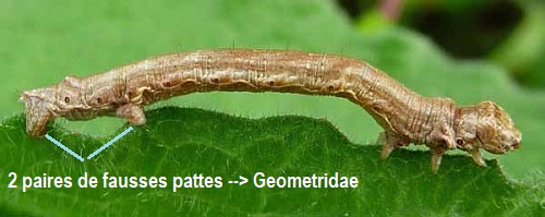 Le nombre de paires de fausses pattes (pattes ventouses) varie selon les familles et va de 2 (pour les Geometridae) à 5, avec toujours une paire de pattes anales.