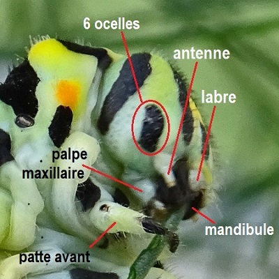 Les ocelles sont dissimulées par le noir des taches latérales, mais sont bien visibles sur la tête d'une chenille qui vient de muer.